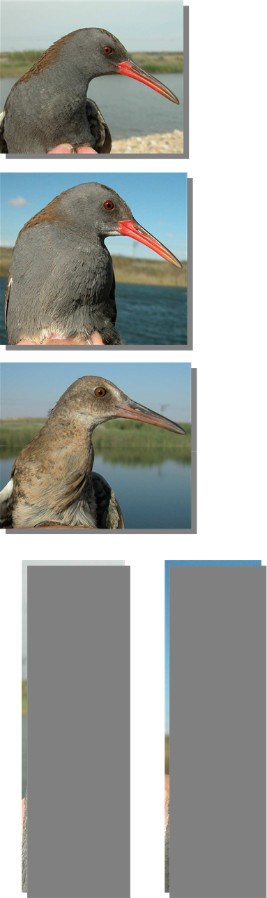Water Rail. Spring. Head pattern and iris colour. From top to b o t t o m :