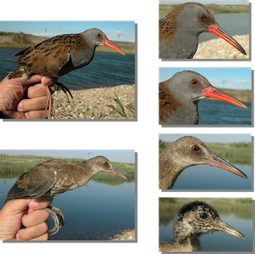 Water Rail. Spring. Head pattern and iris colour. From top to b o t t o m :